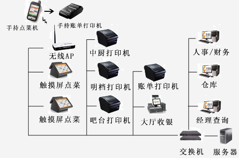 2. 輸入的信息由手持打印機(jī)即時(shí)打印給客戶,相關(guān)信息通過網(wǎng)絡(luò)傳輸?shù)綇N房、吧臺(tái)、大廳收銀的打印終端,進(jìn)行下一步提供菜品及結(jié)算的服務(wù)。